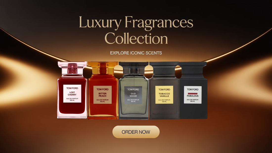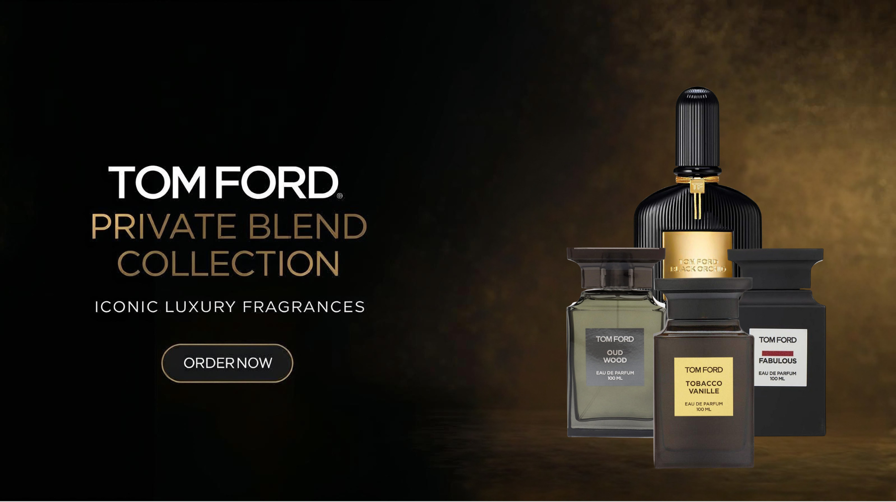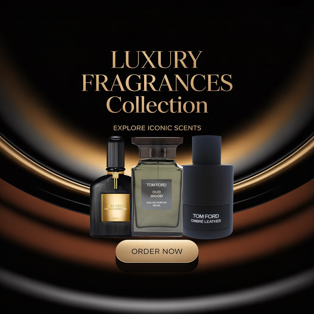 The Tom Ford Private Blend Collection represents the pinnacle of luxury fragrance artistry, showcasing bold, sensual, and unmistakably iconic scents. Featuring standout creations like Tobacco Vanille, Oud Wood, Lost Cherry, and Tobacco Oud, this collection brings together rich woods, warm spices, and deep amber tones for a powerful olfactory experience. Each bottle reflects Tom Ford’s signature sophistication — dark, elegant, and crafted to perfection. The composition of this banner, with its black-and-gold lighting and reflective surfaces, highlights the timeless intensity of these fragrances. Designed for those who express confidence through scent, the collection embodies depth, allure, and pure luxury. The “Order Now” button centered below completes the look, giving the display a premium department-store feel — sleek, commanding, and irresistibly refined.