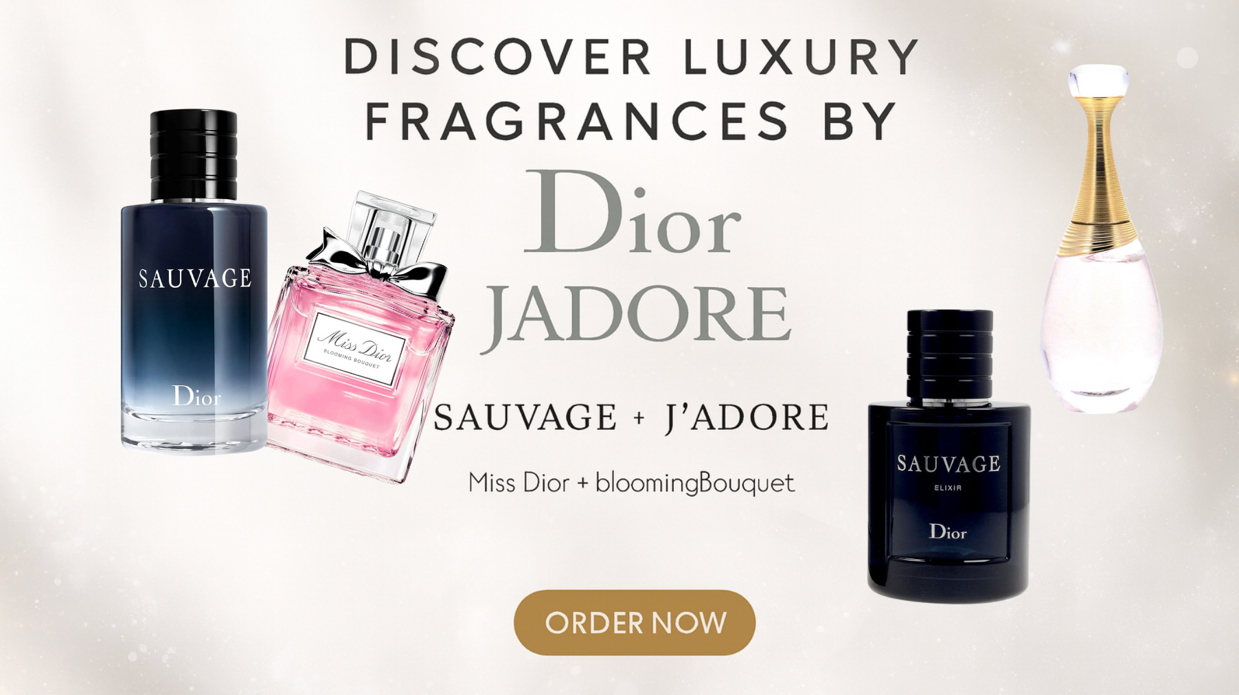 Dior’s luxury fragrance lineup captures elegance, refinement, and timeless beauty in every bottle. Showcased in this radiant white-and-gold setting are three iconic scents: Dior Sauvage, known for its magnetic masculine freshness; J’Adore, celebrated for its luminous and feminine floral glow; and Miss Dior Blooming Bouquet, adored for its soft, romantic sweetness. Together they create a beautifully balanced collection for both men and women. The banner’s clean, glowing aesthetic reflects Dior’s haute couture heritage, allowing every bottle to shine with purity and sophistication. The headline “Discover Luxury Fragrances by Dior” reinforces the exclusivity of the collection, while the “Order Now” button adds a modern, premium touch. This banner is designed for fragrance lovers seeking a refined, elegant, and luxurious sensory experience.
